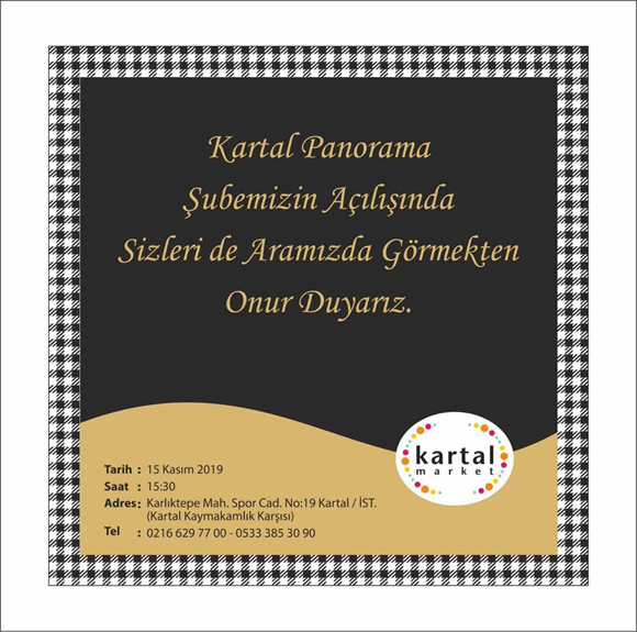 Kartal Market, Panorama şubesini 15 Kasım Cuma günü Kartal'da hizmete açıyor. Kartal Market'in toplam mağaza sayısı böylece 8'e ulaşacak